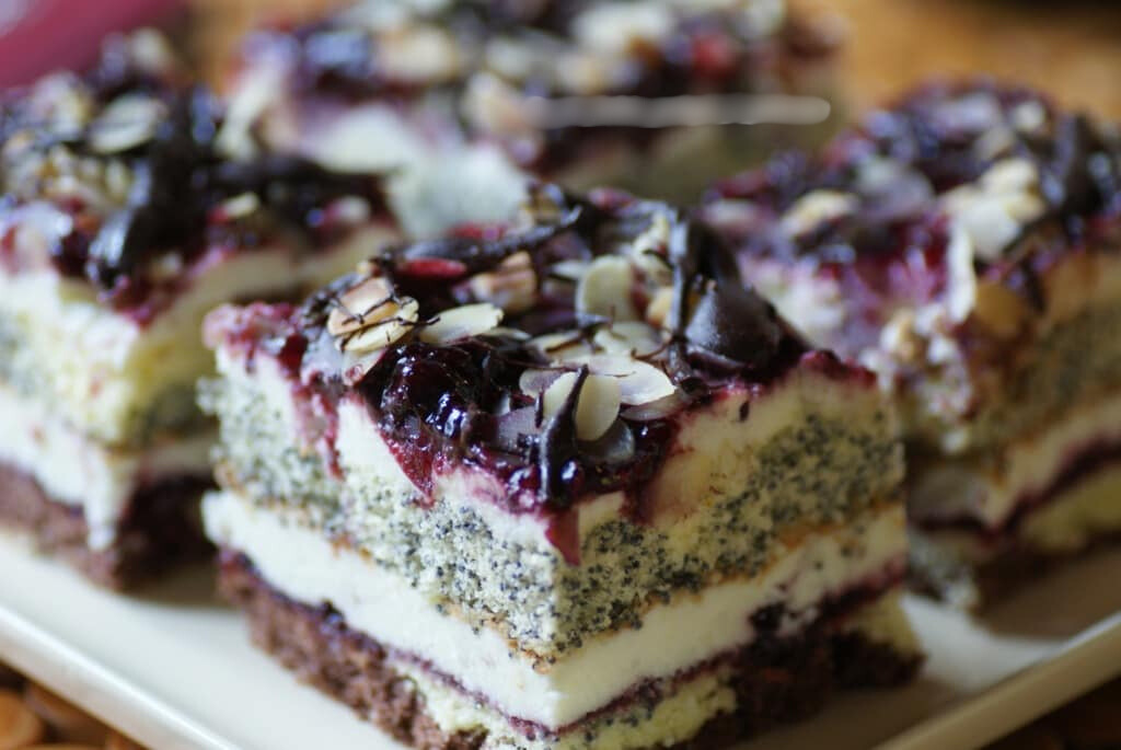 Jabłecznik straciatella z galaretką i kawałkami czekolady.
