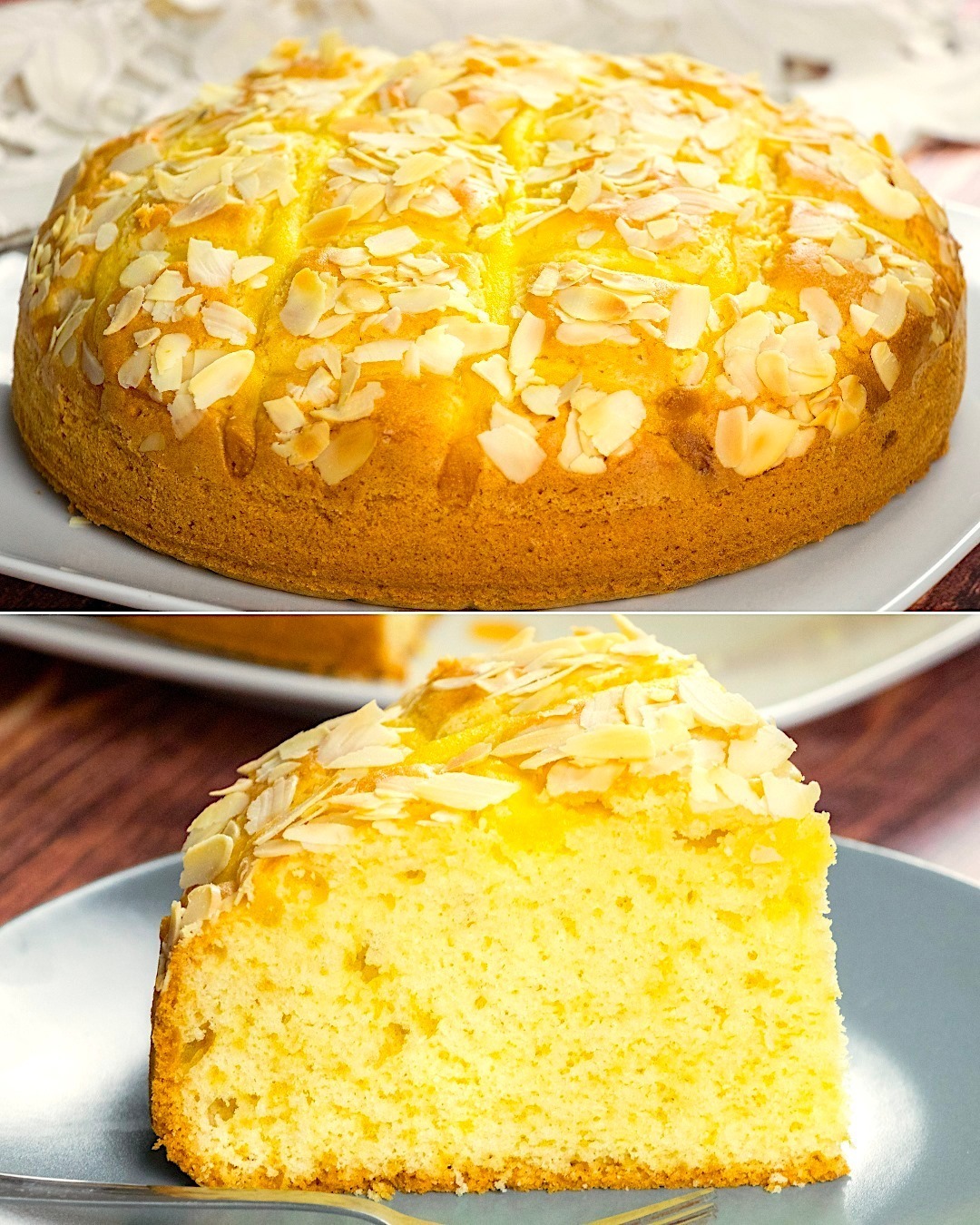 SKŁADNIKI: 260 g mąki 00 16 g proszku do pieczenia szczypta soli 3 jajka 50ml soku pomarańczowego 200 g cukru 100 ml oleju Krem: 1 jajko 50 gr skrobi Skórka pomarańczy 100 ml soku pomarańczowego 100 g cukru 250 ml mleka 100 g masła 20 g płatków migdałowych PRZYGOTOWANIE: Więcej na następnej stronie