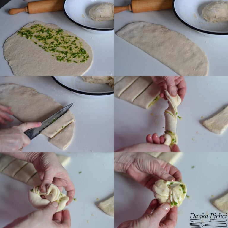 Bułeczki czosnkowe zrobimy z kilku podstawowych składników. Są one mięciutkie i delikatne w środku, pachnące czosnkiem. Bułeczki czosnkowe mogą mieć różne kształty, tak jak u mnie zawijane. Można też wyrośnięte ciasto drożdżowe podzielić na mniejsze równe części, uformować z każdej podłużną bułeczkę, ponownie odstawić do wyrośnięcia, następnie w każdej bułce zrobić tępą stroną noża trzy nacięcia i powkładać w nie masło czosnkowe. Robiąc bułeczki czosnkowe w ten sposób należy miękkie masło wymieszać dokładnie z przeciśniętym przez praskę czosnkiem i natką pietruszki (nie roztapiać masła, jak u mnie). Smaczne bułeczki czosnkowe to świetny pomysł na śniadanie lub kolację. Można je wykorzystać do przygotowania kanapek lub zajadać bez dodatków. Do masła czosnkowego zamiast natki pietruszki sprawdzi się również koperek lub zioła prowansalskie albo inne. W tej wersji bułeczki czosnkowe też bedą pyszne.