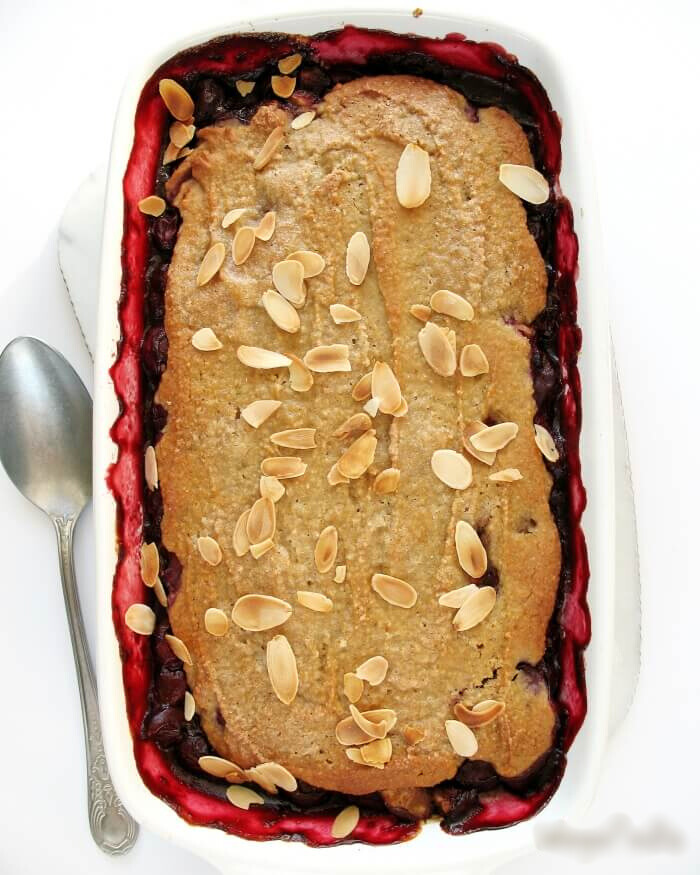 Wegańskie i dietetyczne crumble z owocami, a dokładniej pieczone wiśnie (z dodatkiem bananów i powideł dla zdrowej słodyczy) pod kruchym ciastem bez masła krowiego, białej mąki i góry cukru. Deser jest bardzo łatwy, bezglutenowy i niebiański!